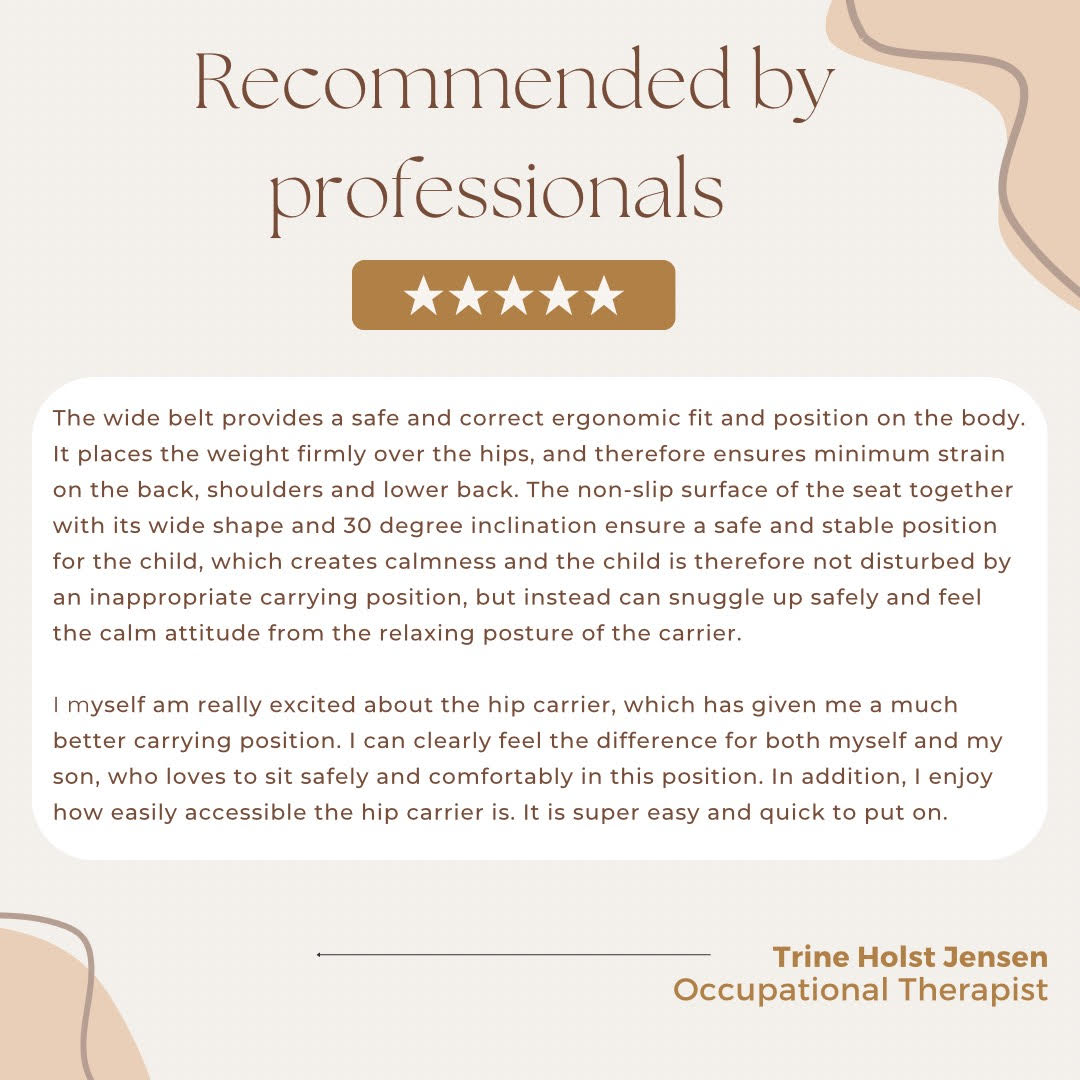 BY MINELLA hip seat is certified and meets the EU's standards for this type of baby equipment both chemically and mechanically. Our hip seat is well thought out and tested. Several professionals have been involved during the design process, so that the right ergonomic fit could be designed and provide the optimal support for you and your child.